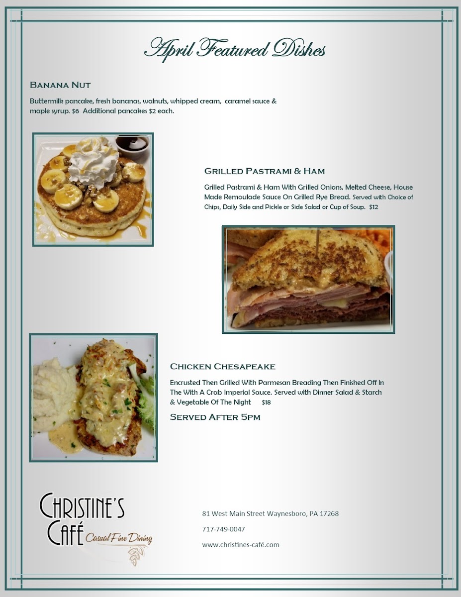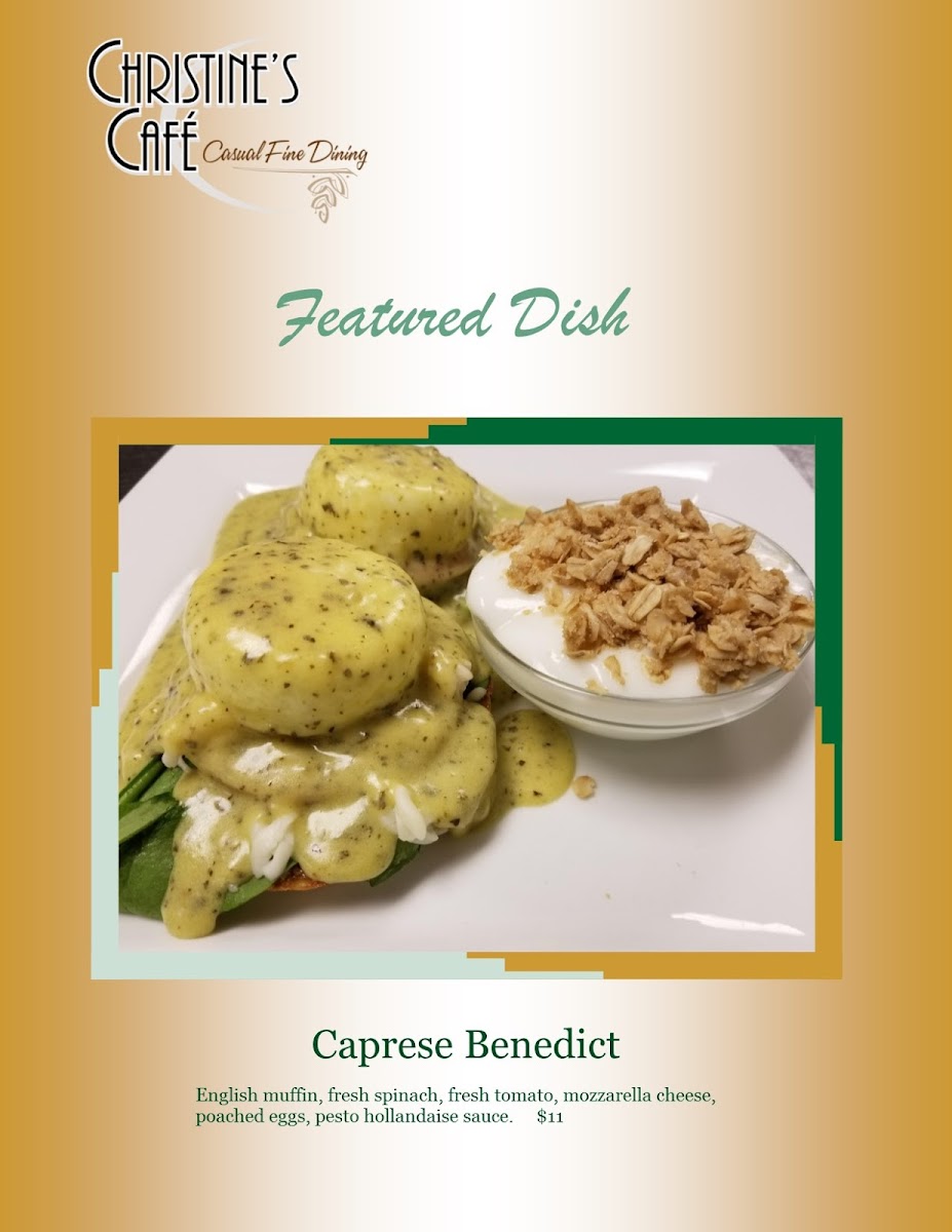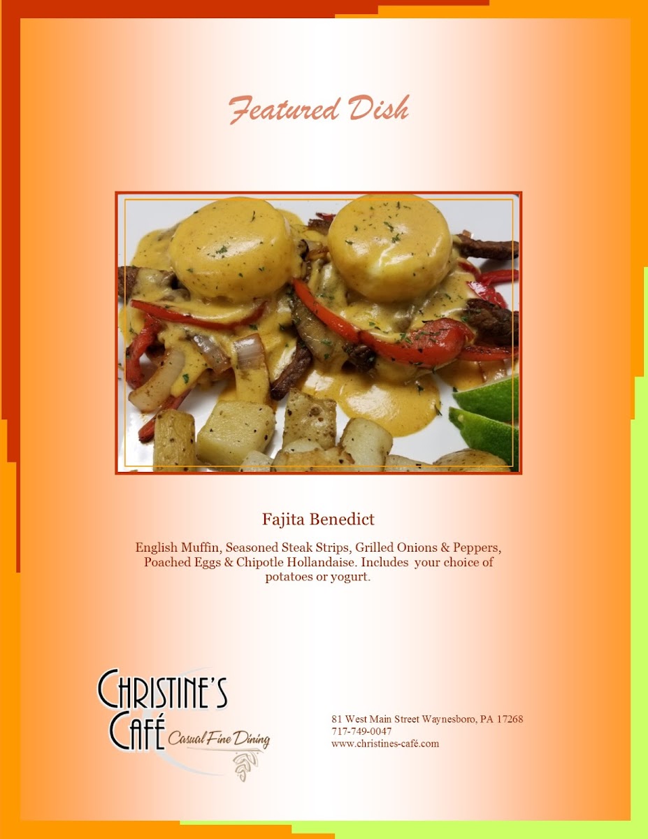 Welcome to Christine's Cafe Casual Fine Dining, located in the heart of Waynesboro, PA. This charming cafe offers an extensive menu that caters to breakfast lovers, lunch enthusiasts, and dinner aficionados alike. Guests rave about the all-day breakfast, with standout dishes including enticing Eggs Benedict, featuring a stunning variety from traditional to seafood options, celebrated by patrons as some of the best in the country.